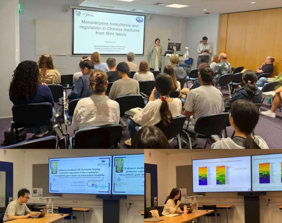 2025年7月25至31日,南京中医药大学药学院刘潺潺副教授率团应邀访问英国约克大学。期间,团队与该校植物生物学高级研究员Benjamin Lichiman博士就荆芥、藿香、三棱等药用植物的生物合成路径、表观调控、工程生物学应用及三维基因组结构等议题进行了深入交流,并确定未来合作方向。刘潺潺副教授还以“Monoterpene Biosynthesis and Regulation in Chinese Medicine from Mint Family”为题作公开报告,会上系统介绍南京中医药大学在合成生物学、交叉学科及数字化科研平台等方面的布局与开放政策,重点推介学校“海外优青”引才计划,诚邀全球青年学者加盟,共同推动中医药国际化。会后,与生物系Ian A. Graham院士就单萜类化合物的生物工程与表观调控等问题进行了单独会面,为后续研究方法的优化奠定了坚实基础。